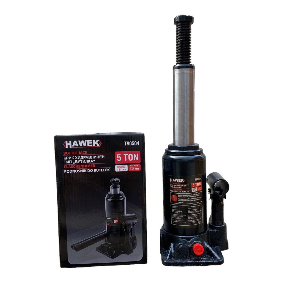 Хидравличният крик от тип бутилка HAWEK с товароносимост 5 тона е предназначен за повдигане на товари с тежест до 5 тона. Максималният ход на буталото е 110 мм, а на винта – 60 мм. Този крик е предназначен за вертикални операции за повдигане. Максималната височина на крика е 351 мм, а минималната – 181 мм. Той се отличава с висока стабилност и компактни размери.