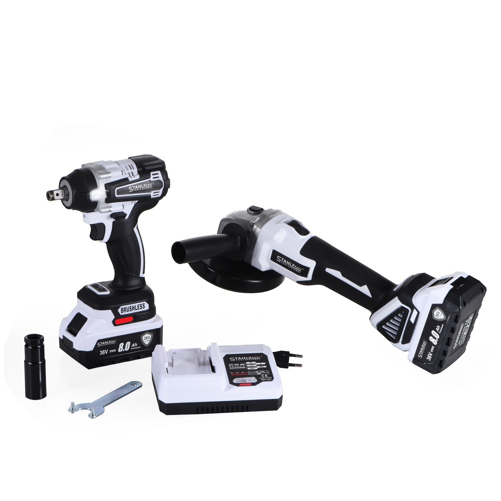 - Качествен немски комплект от акумулаторни машини – ъглошлайф 125мм и ударен Гайковерт 850нм със взаимозаменяеми батерии и удобен куфар за пренос.
