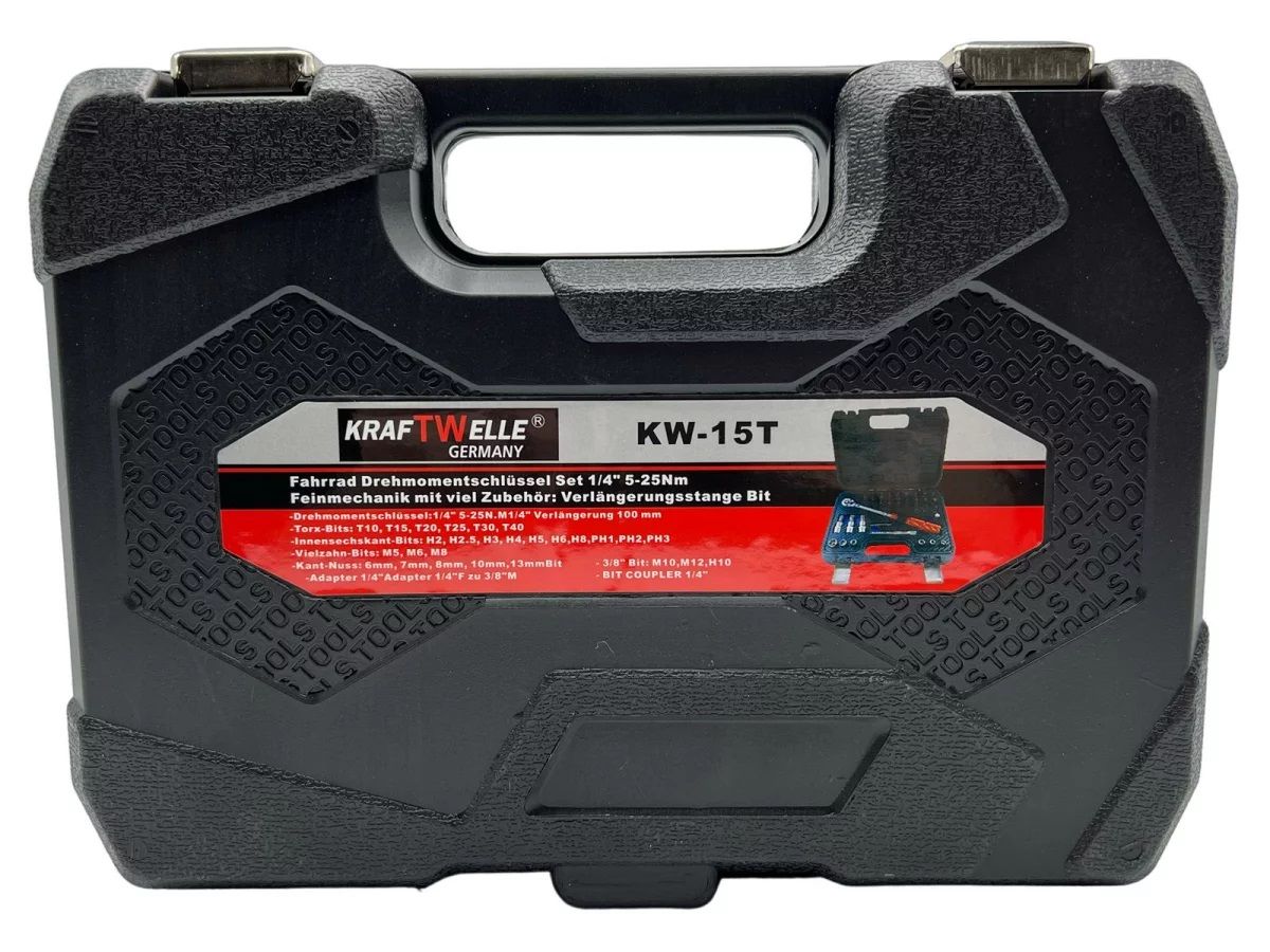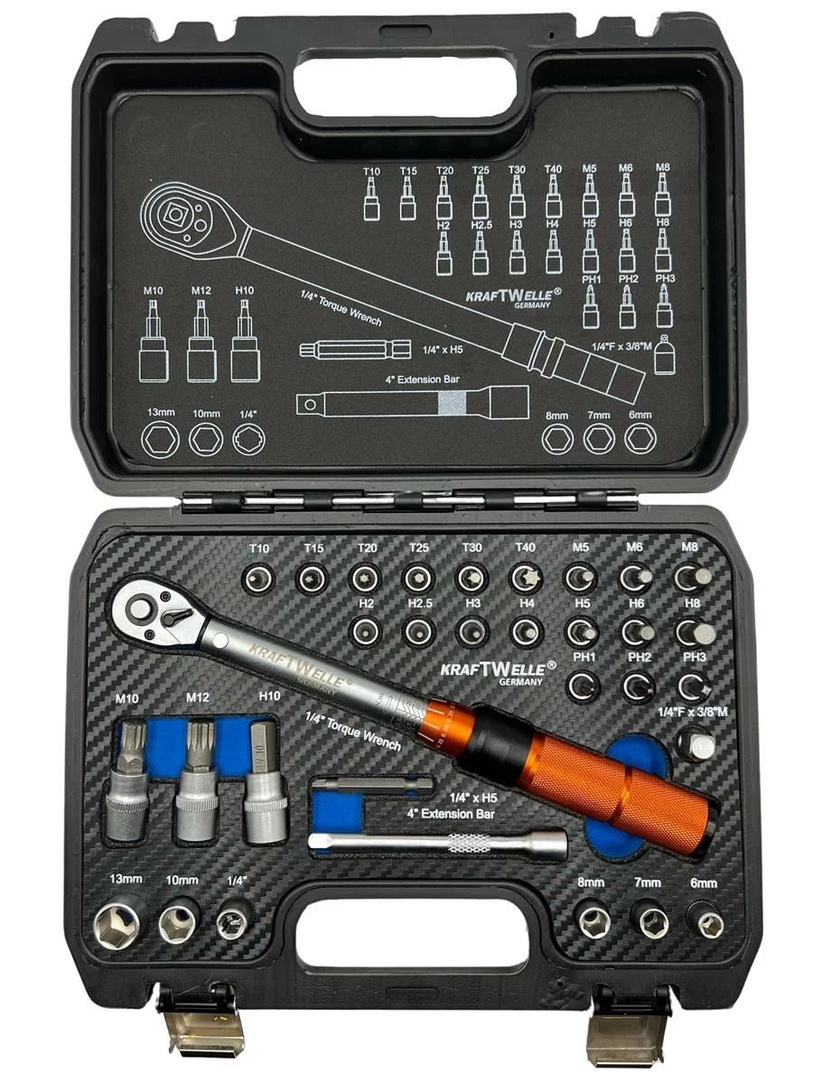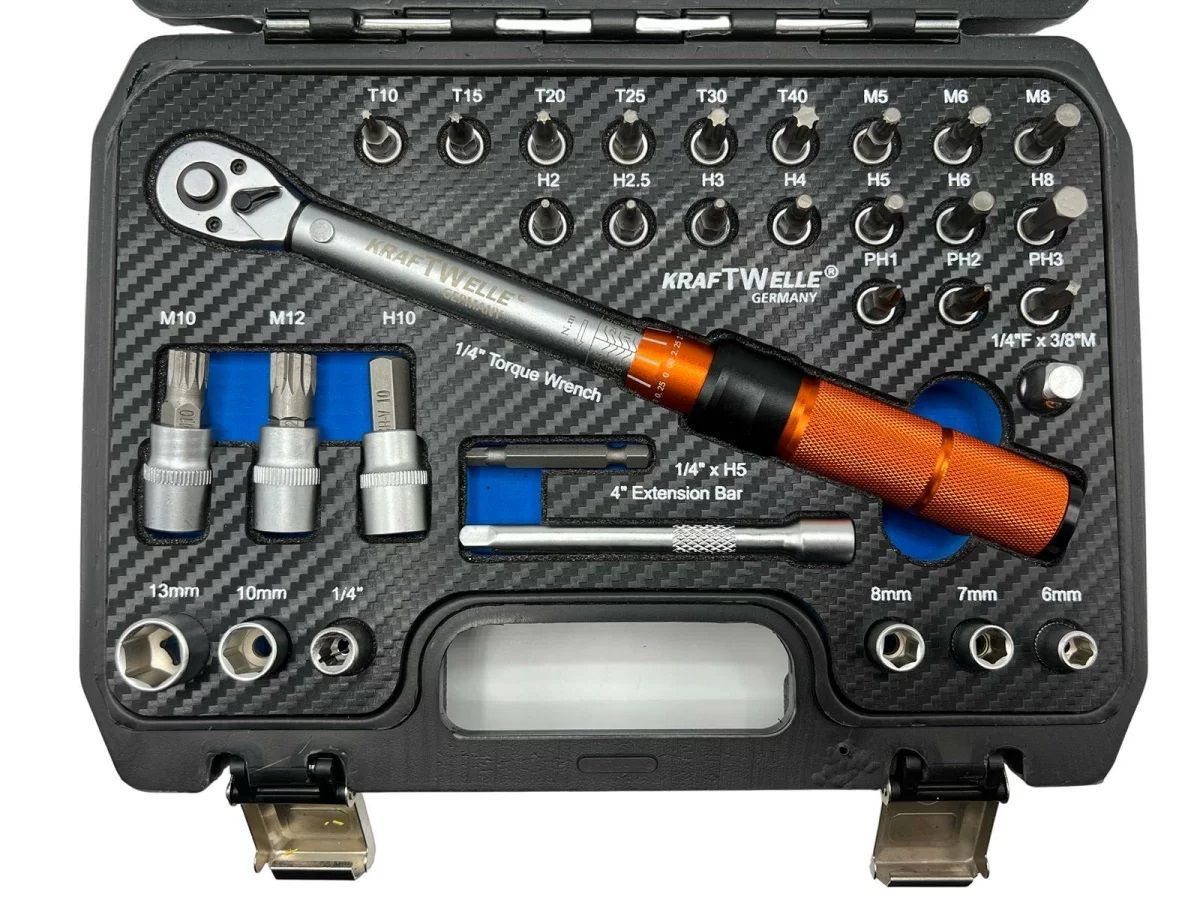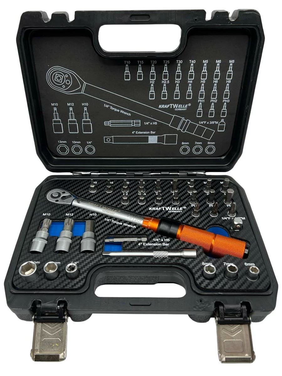 Професионален динамометричен ключ 1/4″ , комплект с аксесоари , KRAFTWELLE. Произведени и тествани съгласно изискванията на DIN ISO 6789 и ASMEB107.14M.
