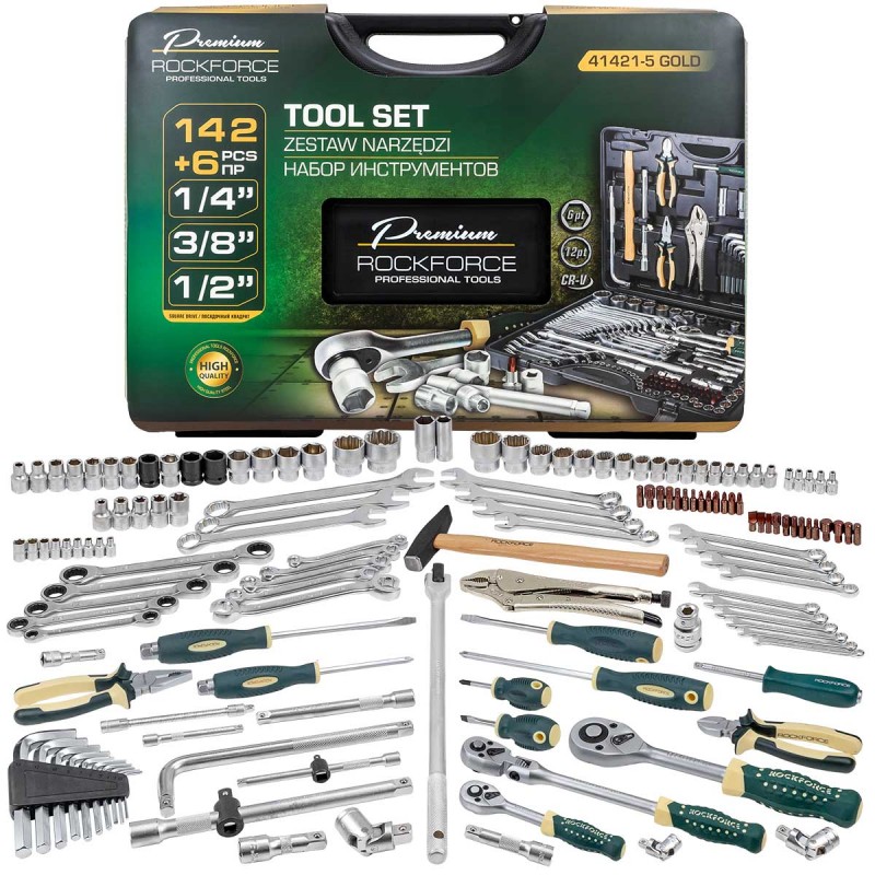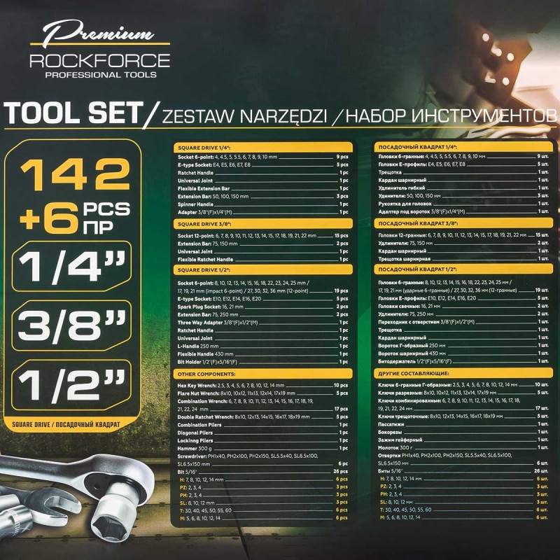Гедоре 142+6 части 1/4″, 3/8″, 1/2″ ROCKFORCE PREMIUM