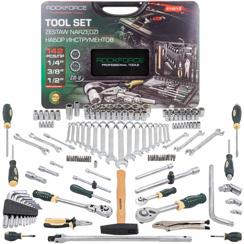 Комплектът инструменти ROCKFORCE RF-41421-5 са изработен от висококласна хром-ванадиева стомана с добавени специални метални смеси за отлични физични и механични свойства. Инструментите са с повърхностна обработка (перлена и никелова), която осигурява защита срещу корозия и придава естетичен вид.