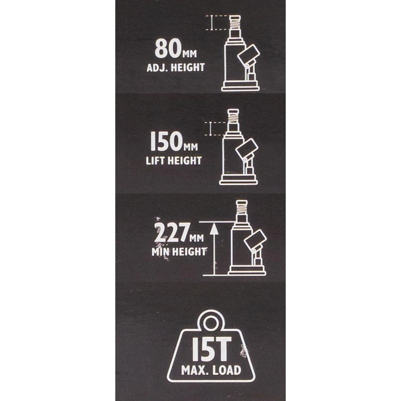 Хидравличен крик JCB е предназначен за товари с тегло до 15т. Максималният ход на буталото е 150 мм, а на винта 80 мм. Предназначен е за вертикални подемни операции. Максималната му височина е 457 мм, а минималната 227 мм.