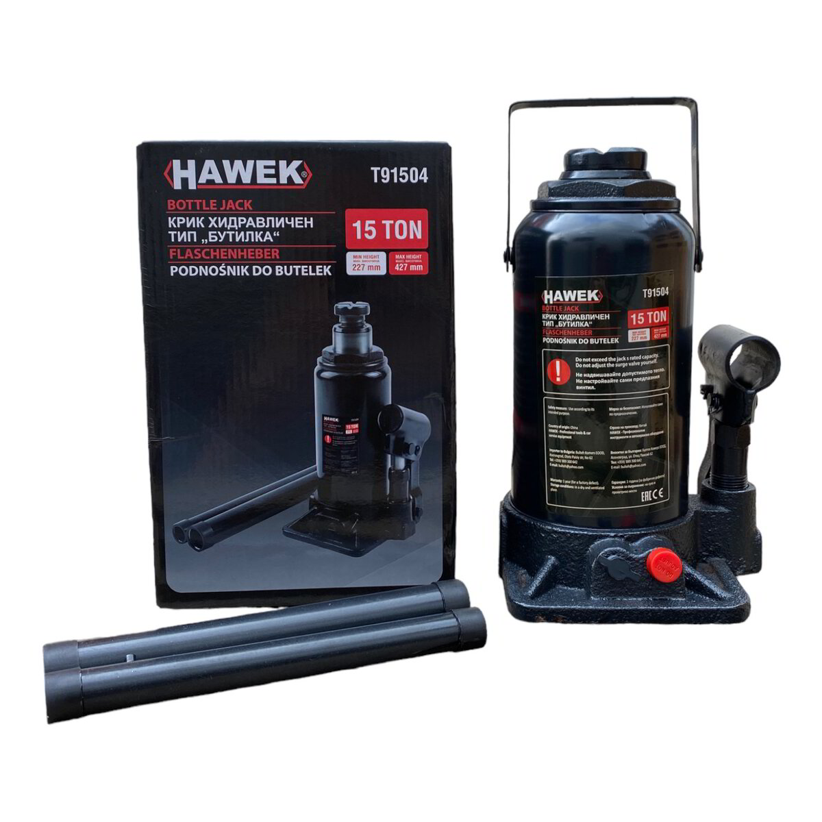 Хидравличният крик от тип „бутилка“ на HAWEK с товароносимост 15 тона е проектиран за товари с тежест до 15 тона. Максималният ход на буталото е 140 мм, а на винта – 60 мм. Този крик е предназначен за вертикални подемни операции и има максимална височина от 427 мм и минимална от 227 мм. Той се отличава с висока стабилност и компактен размер.