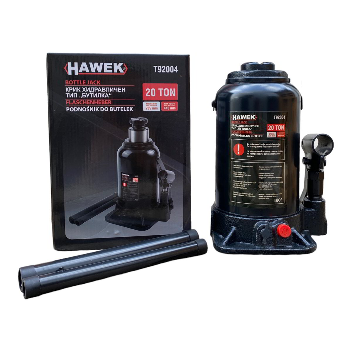 Хидравличният крик от тип бутилка с товароносимост 20 тона, произведен от HAWEK, е предназначен за натоварване с тежест до 20 тона. Максималният ход на буталото е 150 мм, а на винта – 60 мм. Този крик е предназначен за вертикални подемни операции. Максималната височина на крика е 445 мм, а минималната – 235 мм. Той се отличава с висока стабилност и компактен размер.