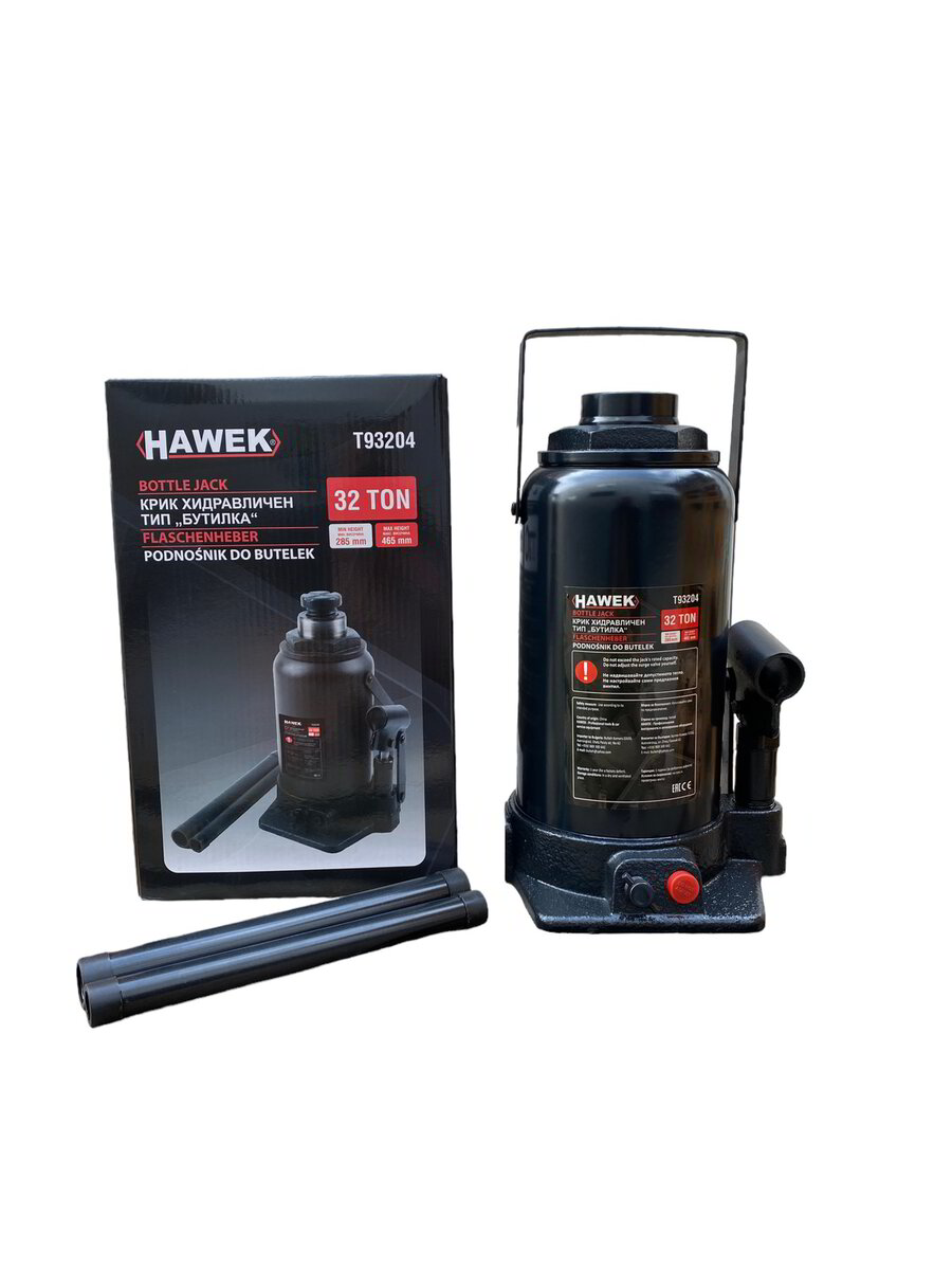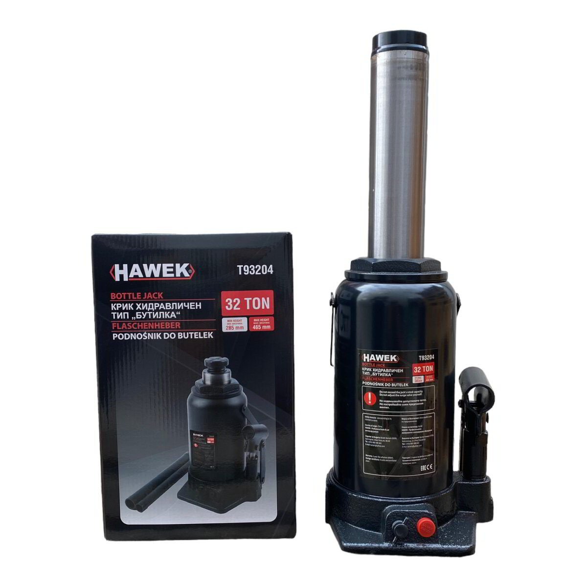 Хидравличният крик от тип бутилка с товароносимост 32 тона на HAWEK е предназначен за подем на товари с тегло до 32 тона. Максималното движение на буталото е 180 мм. Той е предназначен за вертикални подемни операции. Максималната височина на крика е 465 мм, а минималната – 285 мм. Той е с висока стабилност и компактни размери. Характеристиките му включват товароносимост от 32 тона, максимална височина от 465 мм, минимална височина от 255 мм и височина на повдигане от 180 мм.