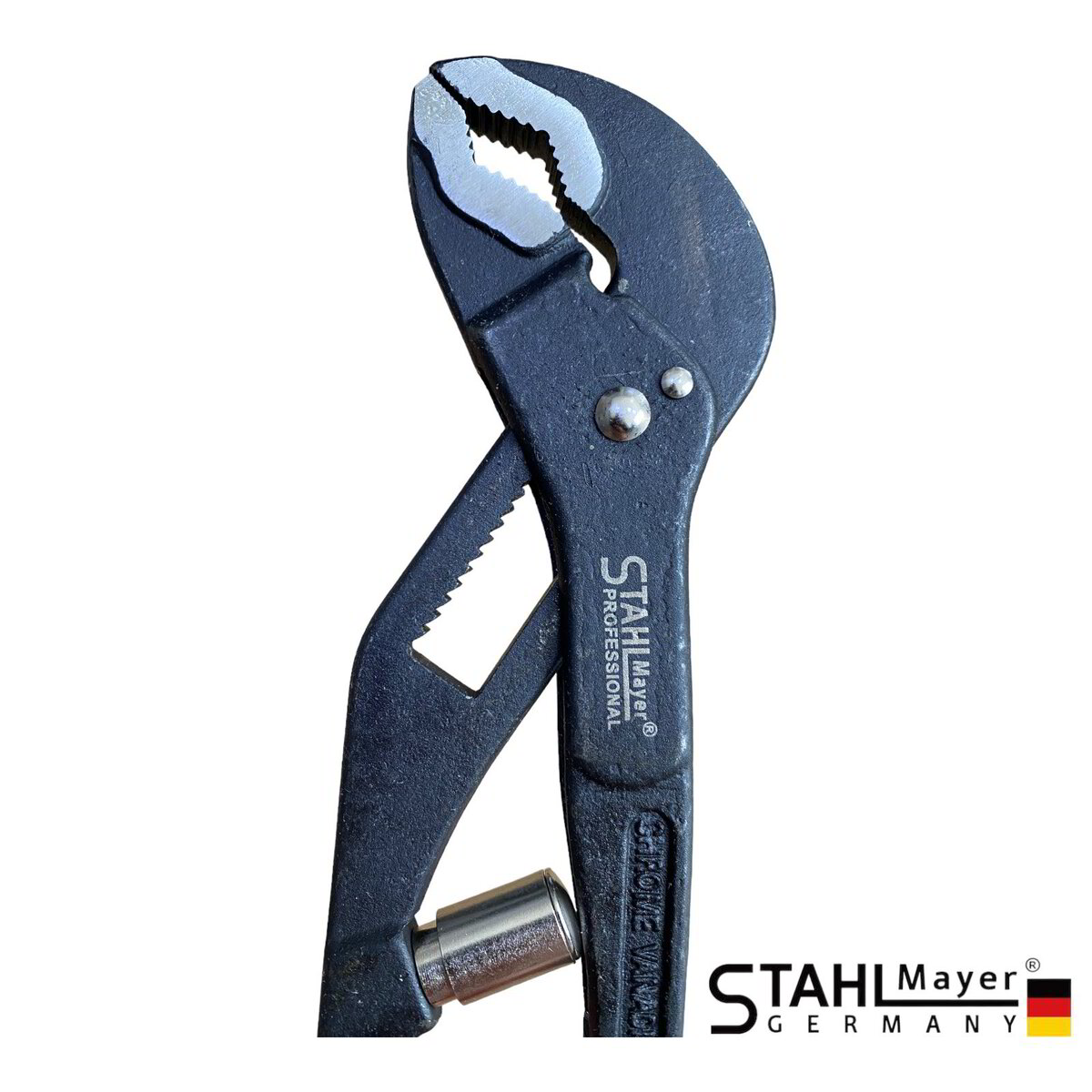Клещите гарги на марката STAHLMAYER са автоматични и професионални. Те са снабдени с тресчотен механизъм, който осигурява бърз и лесен захват. Тези клещи са предназначени за дълготрайна употреба и са изработени от висококачествена стомана. Те са идеални за работа с тръбни системи и други предмети с различни размери и профили. Клещите са здрави и устойчиви на големи натоварвания, а дългите рамена осигуряват здрав захват без много усилия.
