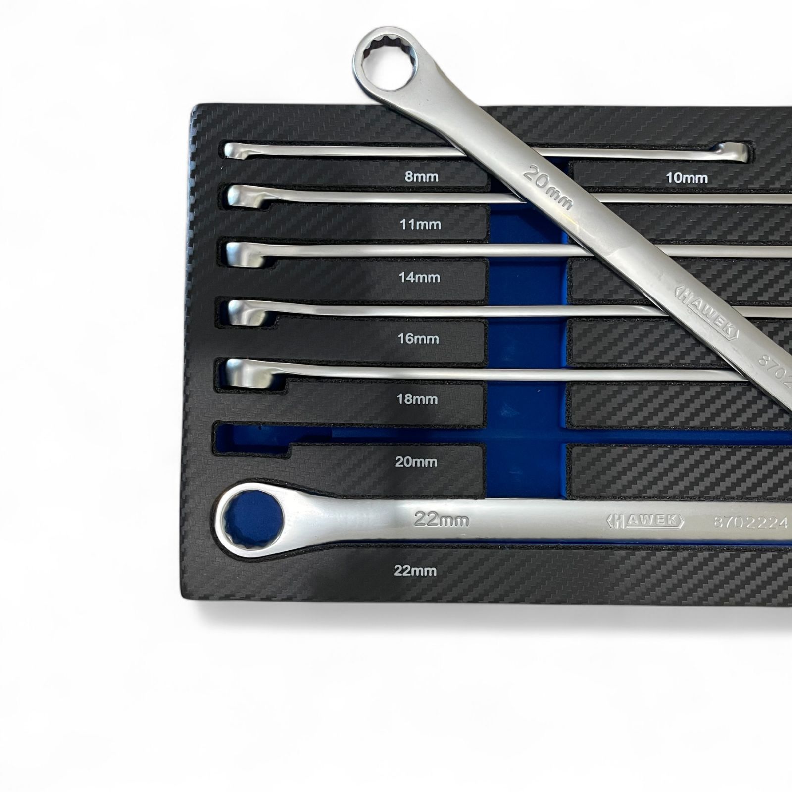 Комплект удължени прави звезди 8 – 24 мм 7 части HAWEK изработени от хром ванадиева стомана , поставени в устойчива EVA тарелка с карбоново покритие.