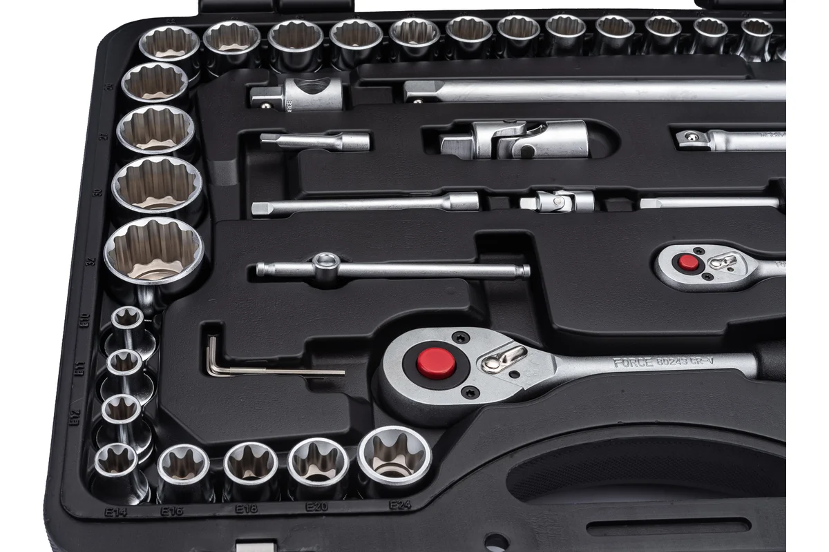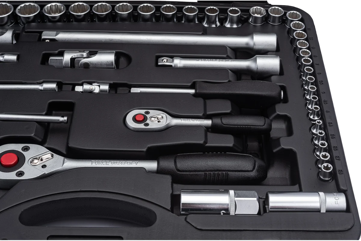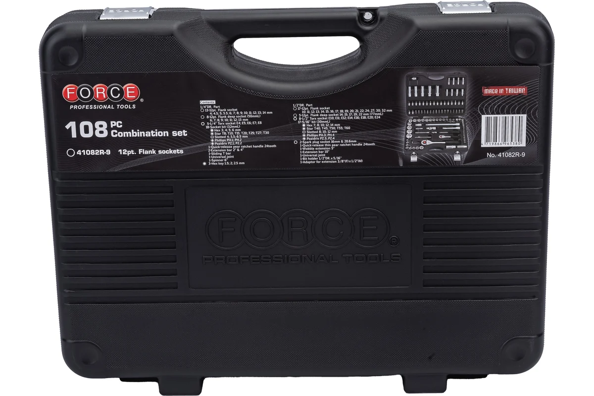 FORCE 41082-5 е с размер 1/4″ – 1/2″ и се състои от 108 части в удобен за работа и съхранение куфар.