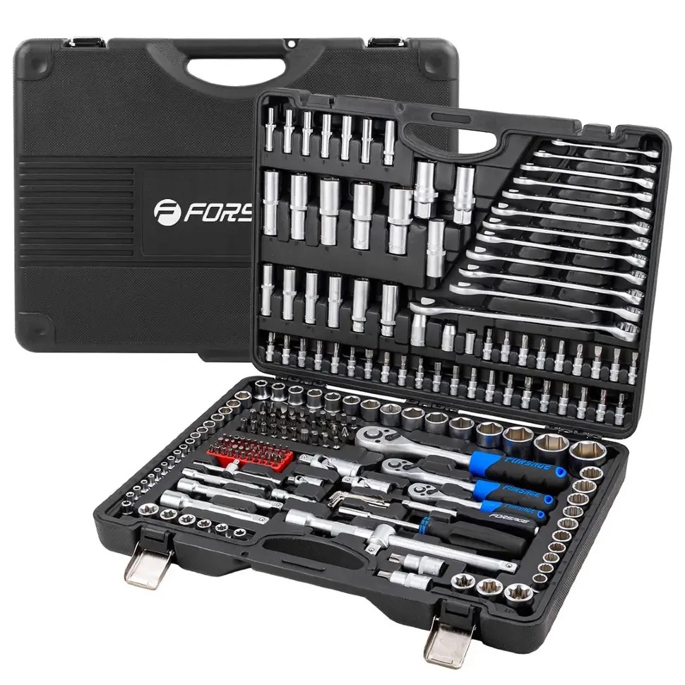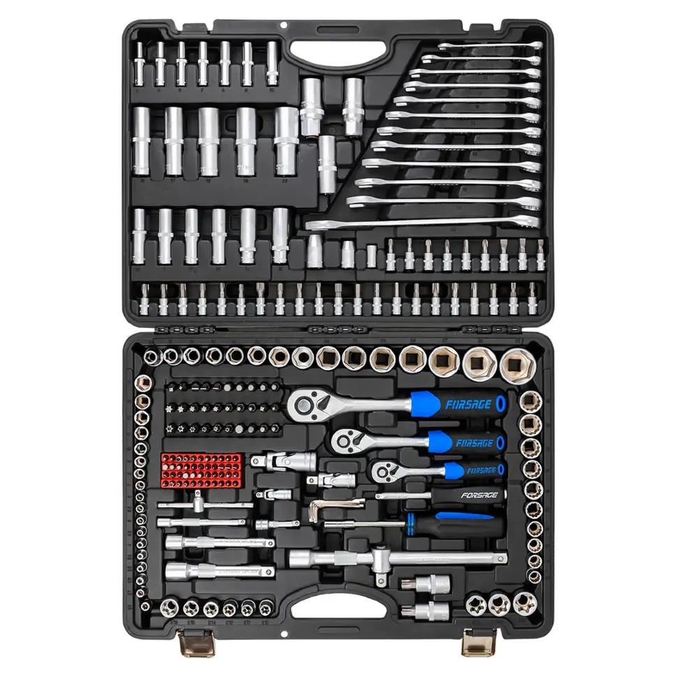 Професионален комплект гедоре FORSAGE – 216 части, предназначен за интензивна сервизна и индустриална употреба. Комплектът включва пълен набор инструменти със задвижване 1/4″ , 3/8″ и 1/2″, изработени от хром-ванадиева стомана (Cr-V).
