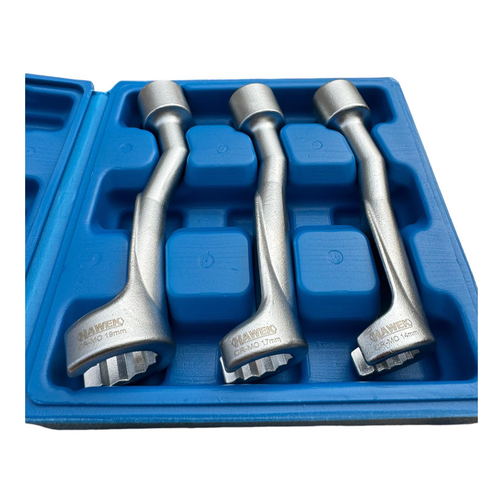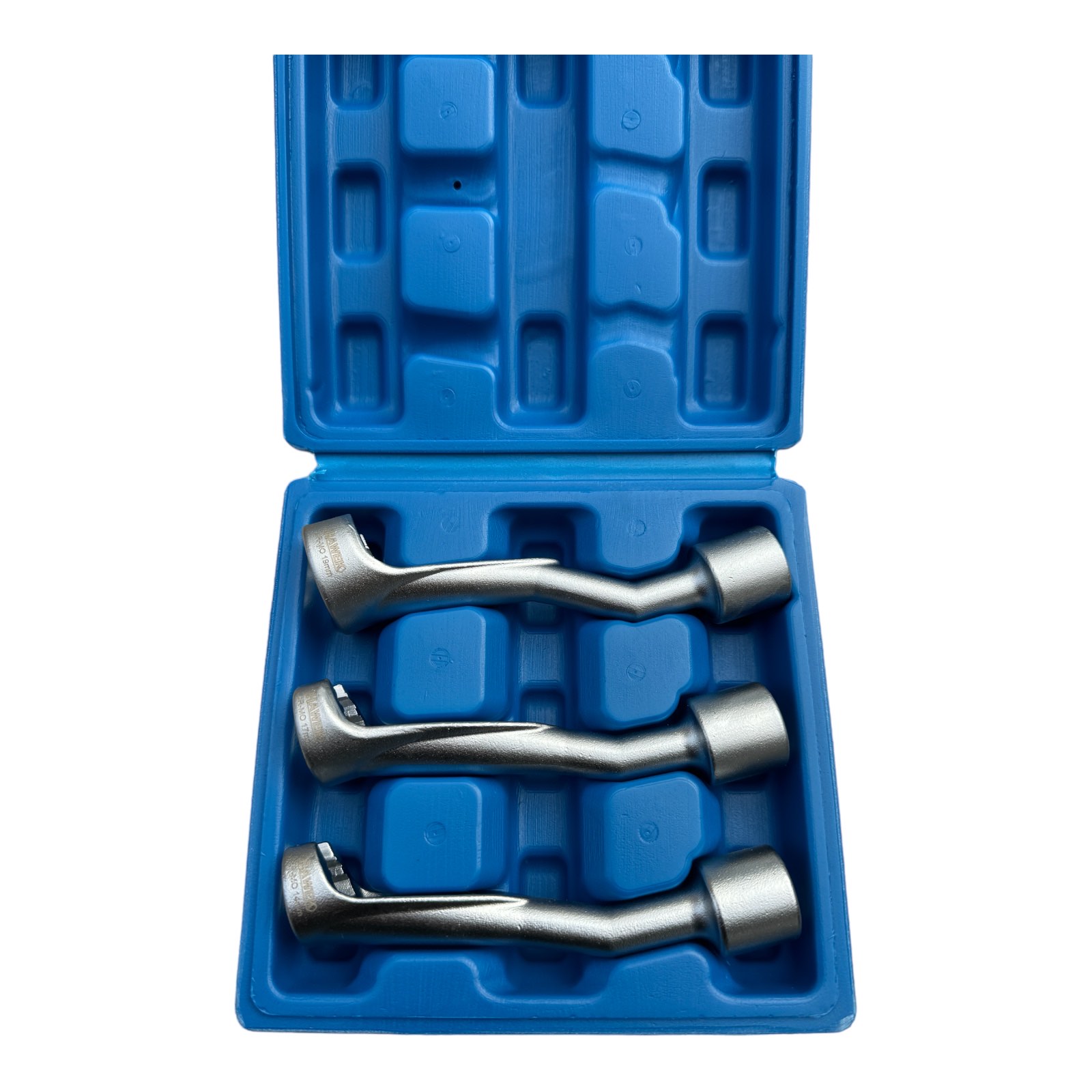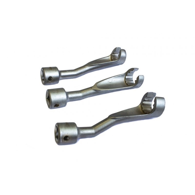 Комплект отворени дванадесетостенни ключове за отвиване и завиване на гайките на тръбичките за високо налягане към горивните дюзи или помпата.