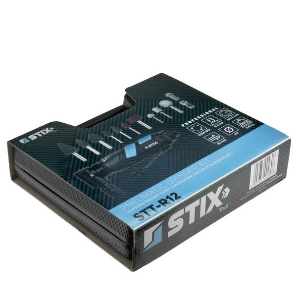 Комплектът STIX Tool STT-R12 представлява професионален пневматичен ъглошлайф, задвижван със сгъстен въздух, предназначен за шлифоване, фрезоване, почистване на неравности и гравиране. Подходящ е както за сервизни дейности, така и за индивидуална употреба в работилници и вулканизаторни услуги.