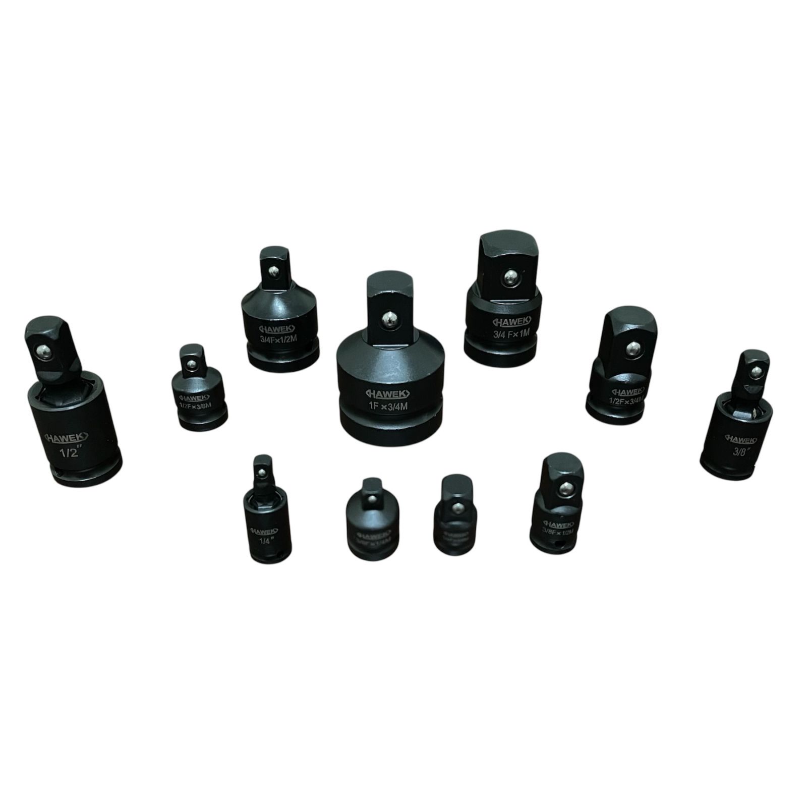 Комплект ударни адаптери (преходници) и карета за гедоре 1/4″, 3/8″, 1/2″ 11 части HAWEK   КОМПЛЕКТЪТ ВКЛЮЧВА: 1/4″(F) x 3/8″(M)...Вижте пълното описание...