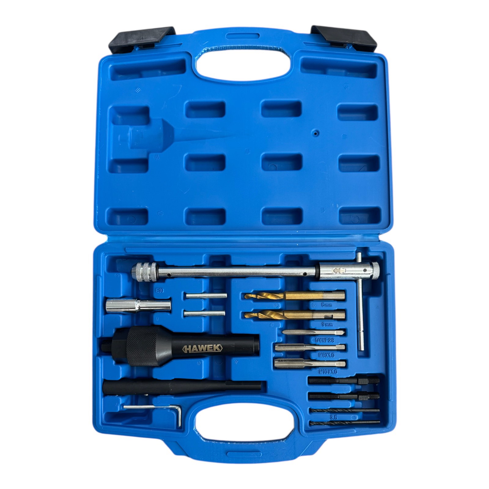 Професионален инструментален комплект, предназначен за демонтаж на скъсани или заседнали подгряващи свещи без необходимост от демонтаж на цилиндровата глава. Комплектът улеснява възстановяването на резбите и осигурява прецизна и безопасна работа при сервизно обслужване на дизелови двигатели.