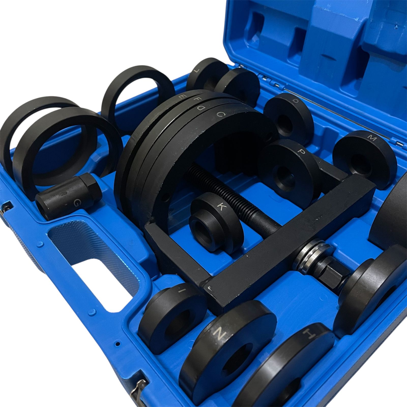 Комплектът включва разнообразни притискащи плочи с различни размери, което позволява работа с лагери с различни диаметри. Благодарение на центриращото устройство, винтът винаги е позициониран правилно, осигурявайки прецизност и стабилност при работа.