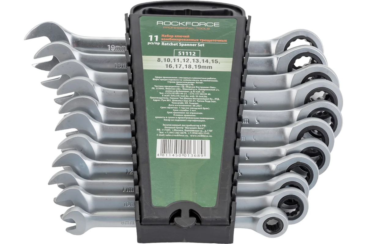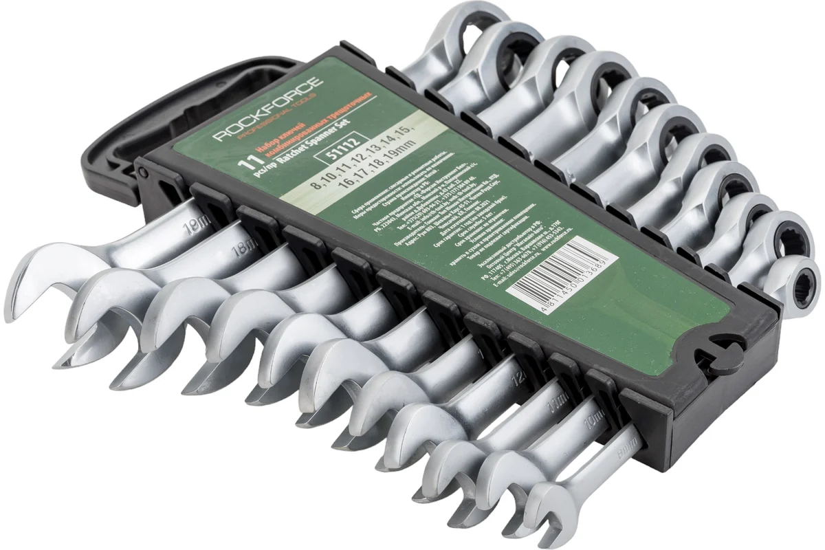 Професионален комплект тресчотни звездогаечни ключове ROCKFORCE, подредени в удобна пластмасова стойка. Инструментите са изработени от висококачествена хром-ванадиева стомана и предлагат надеждност, прецизност и комфорт при работа в сервизни и монтажни дейности.