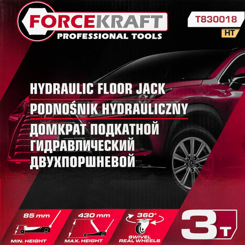 Хидравличният крик FORCEKRAFT FK-T830018 е висококачествен инструмент, създаден за професионално и ежедневно ползване. Той е идеален за автосервизи, магазини за гуми и домашни гаражи, като осигурява безопасно и ефективно повдигане на автомобили и тежки товари до 3 тона.