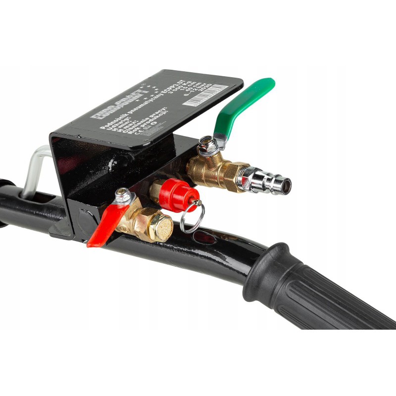 - Сферични кранове 3/8” с удобни цветно кодирани лостове: захранване – зелено, изпускане – червено
