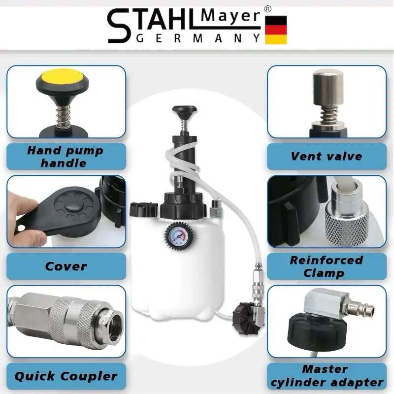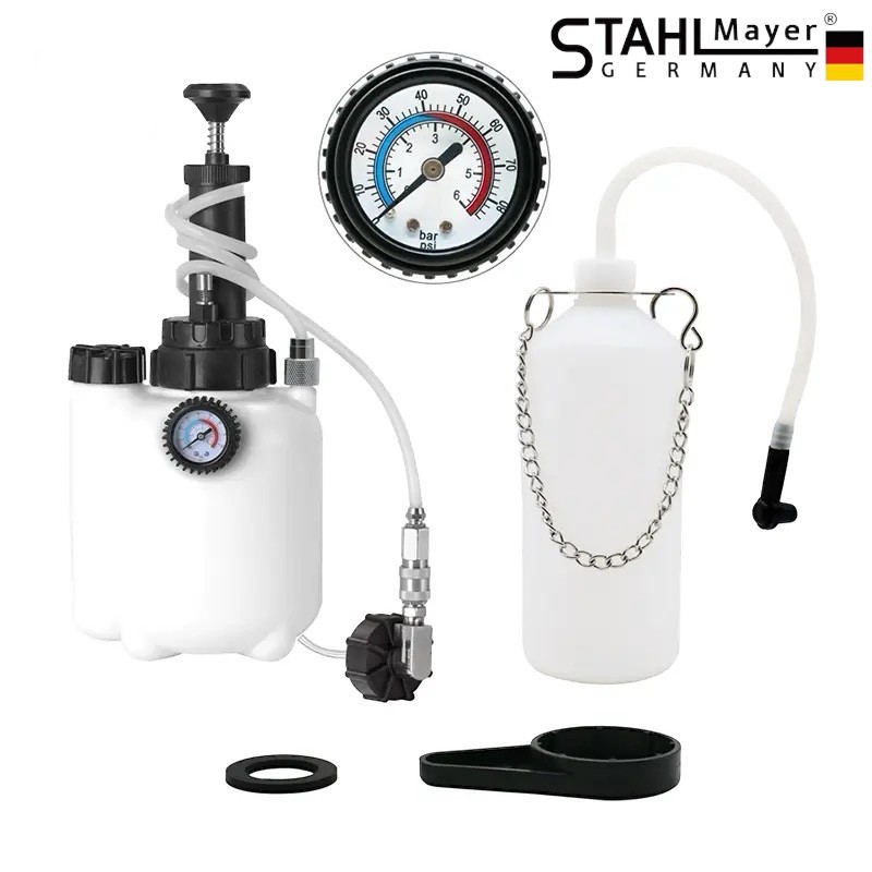 Комплект вакуум помпа за обезвъздушаване на спирачки STAHLMAYER е с работно налягане от 0.7 до 2 бара. Служи както за обезвъздушаване, така и за източване на спирачната течност. Има капацитет на резервоара 3 литра и се доставя с допълнителна бутилка с вместимост 1 литър. Намира приложение за проверка херметичността на различните системи на автомобила. Снабдена е с манометър, позволяващ лесно следене на стойностите на вакуума и налягането. В комплекта има универсален 42 мм адаптер, който пасва на повечето европейски автомобили.