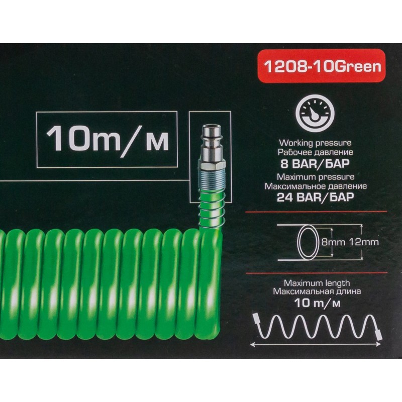 10 метра спирален, пневматичен маркуч. Необходим за работа с всеки компресор. Оборудван с бързи съединители, към него може да се свърже всяко пневматично устройство.