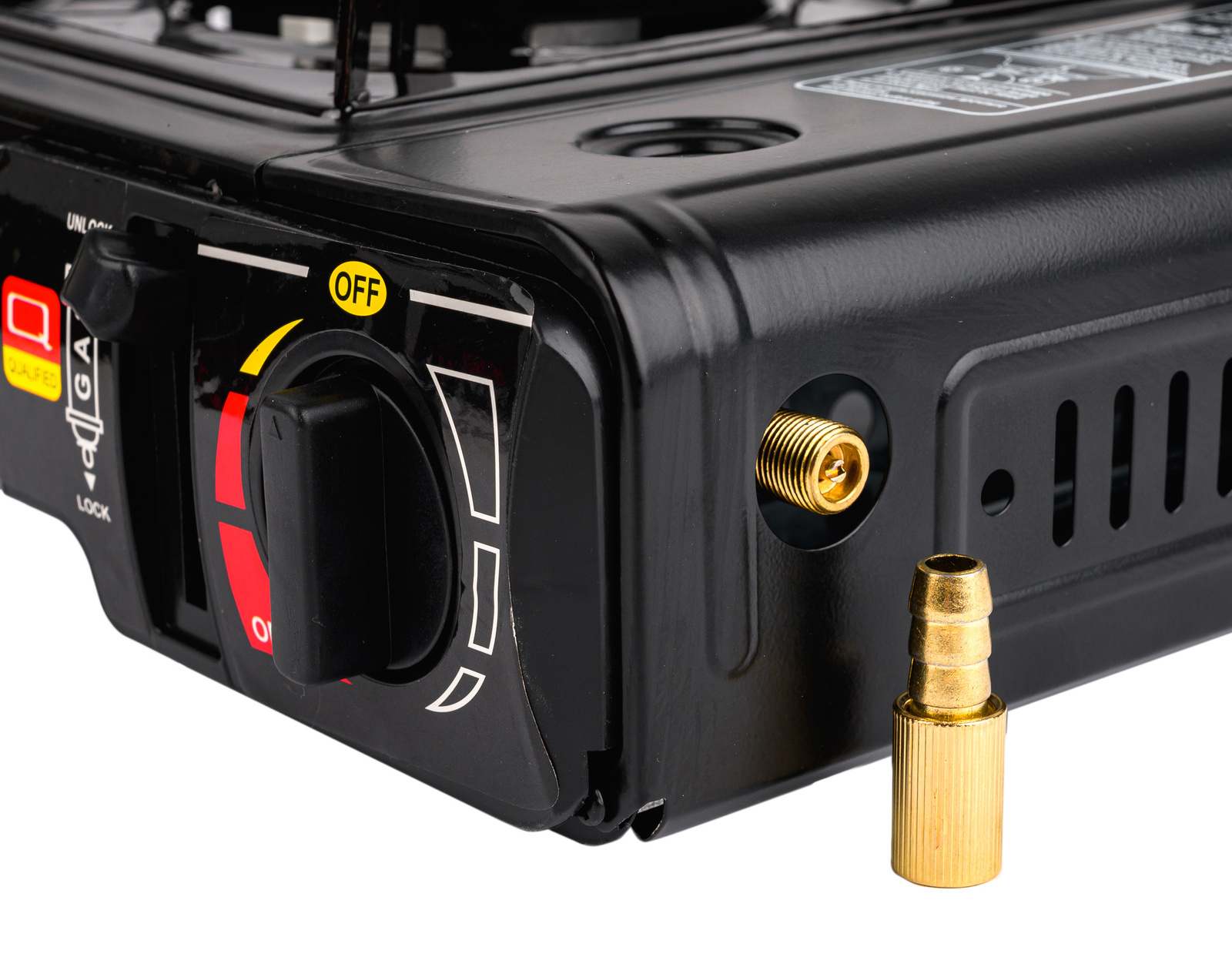 Работи както с портативни газови бутилки, така и със стандартни къмпинг, и битови бутилки за газ.