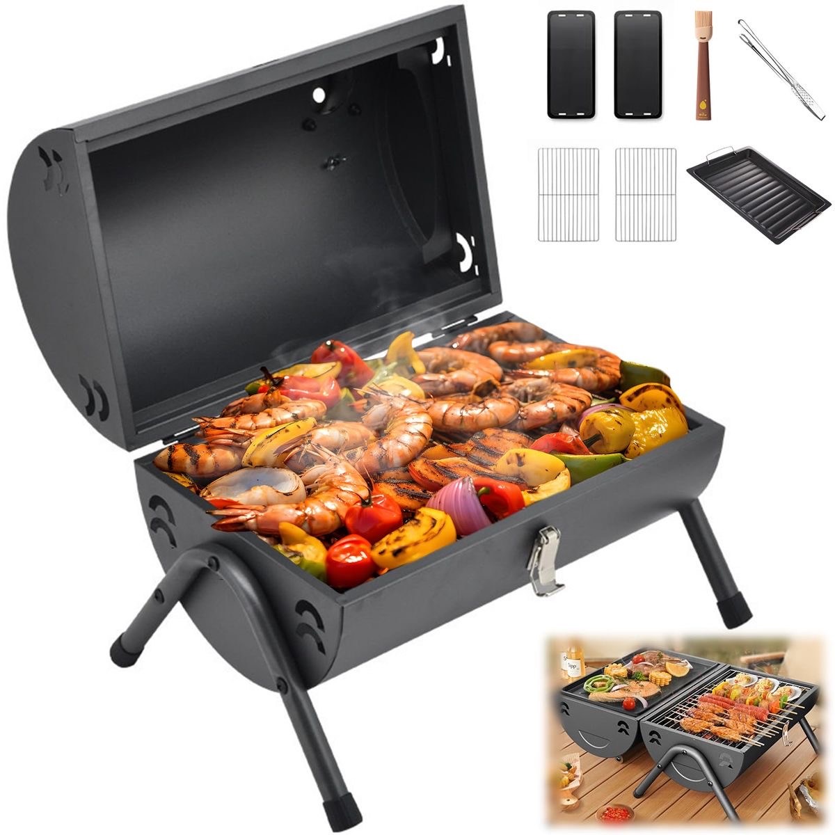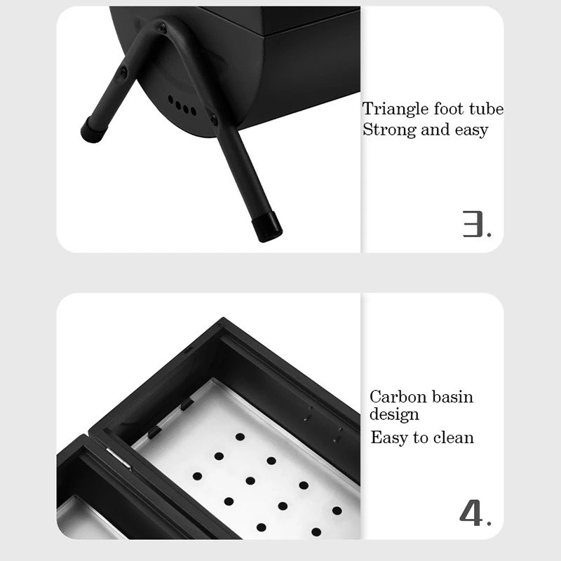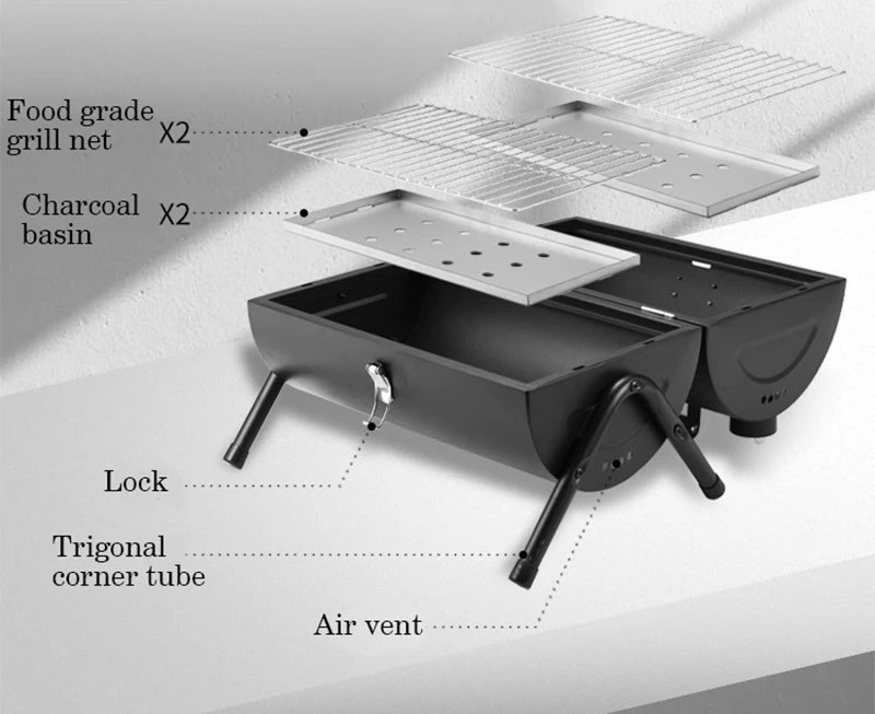 В комплекта към барбекюто ще откриете общо 4 решетки тип скара – 2 големи и 2 малки. Малките се поставят на дъното на барбекюто и задържат въглищата. Големите се използват за печене на храната. Когато разтворите напълно капака на скарата, неговата дръжка се превръща в поставка и го задържа в легнало положение върху земята. Върху втория капак се поставя другия сет скари и така на практика ще разполагате с 2 барбекюта, на които отделно да печете месо и зеленчуци.