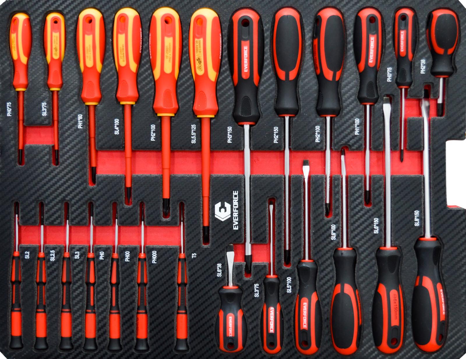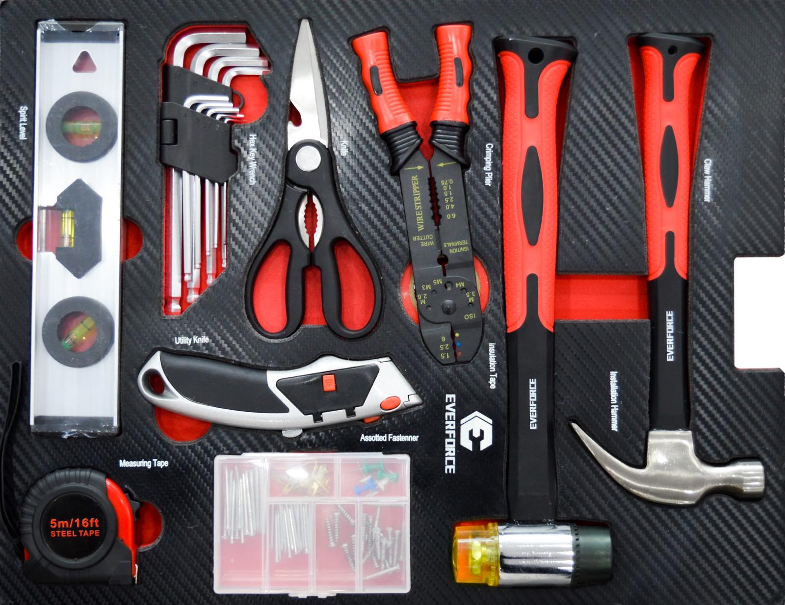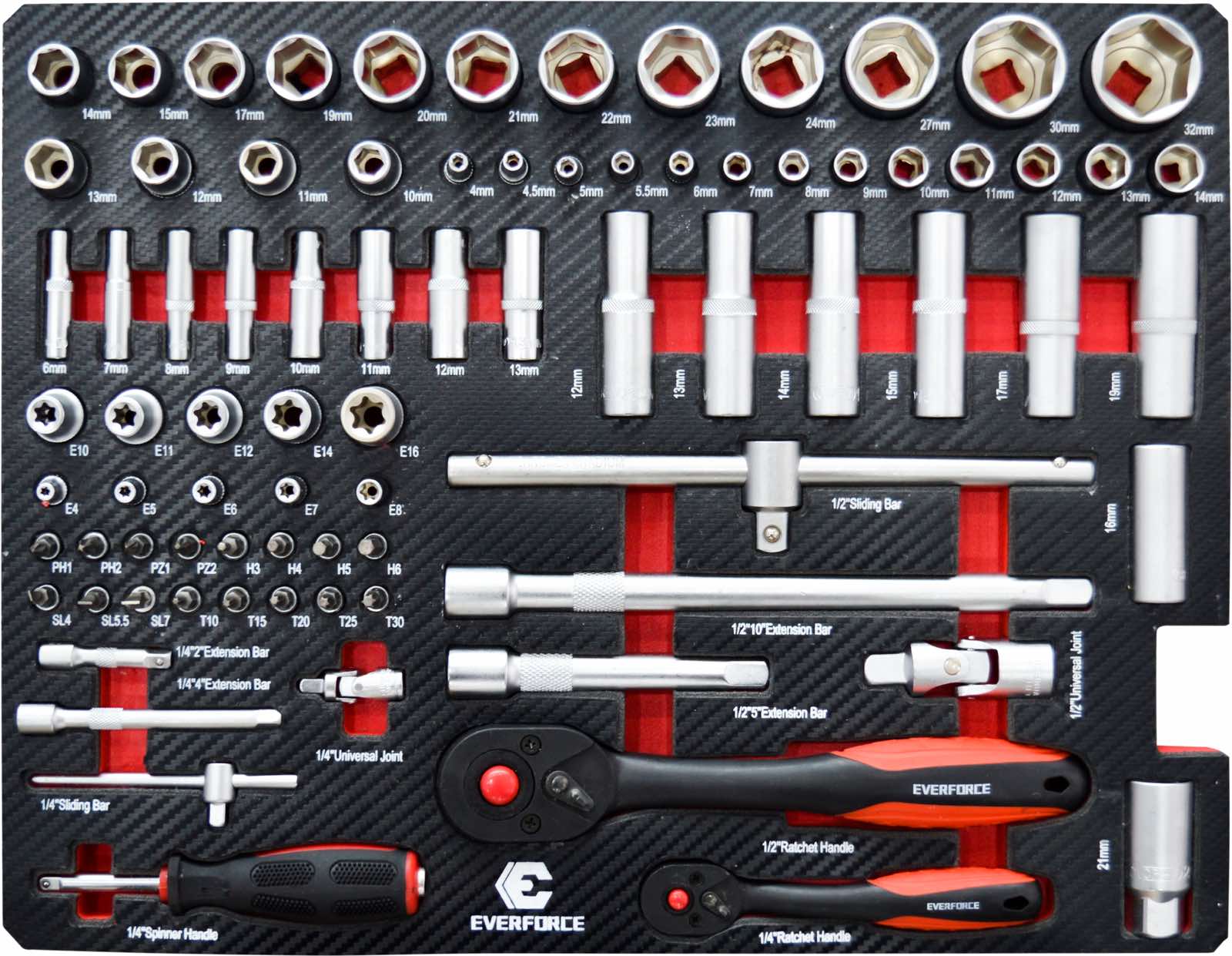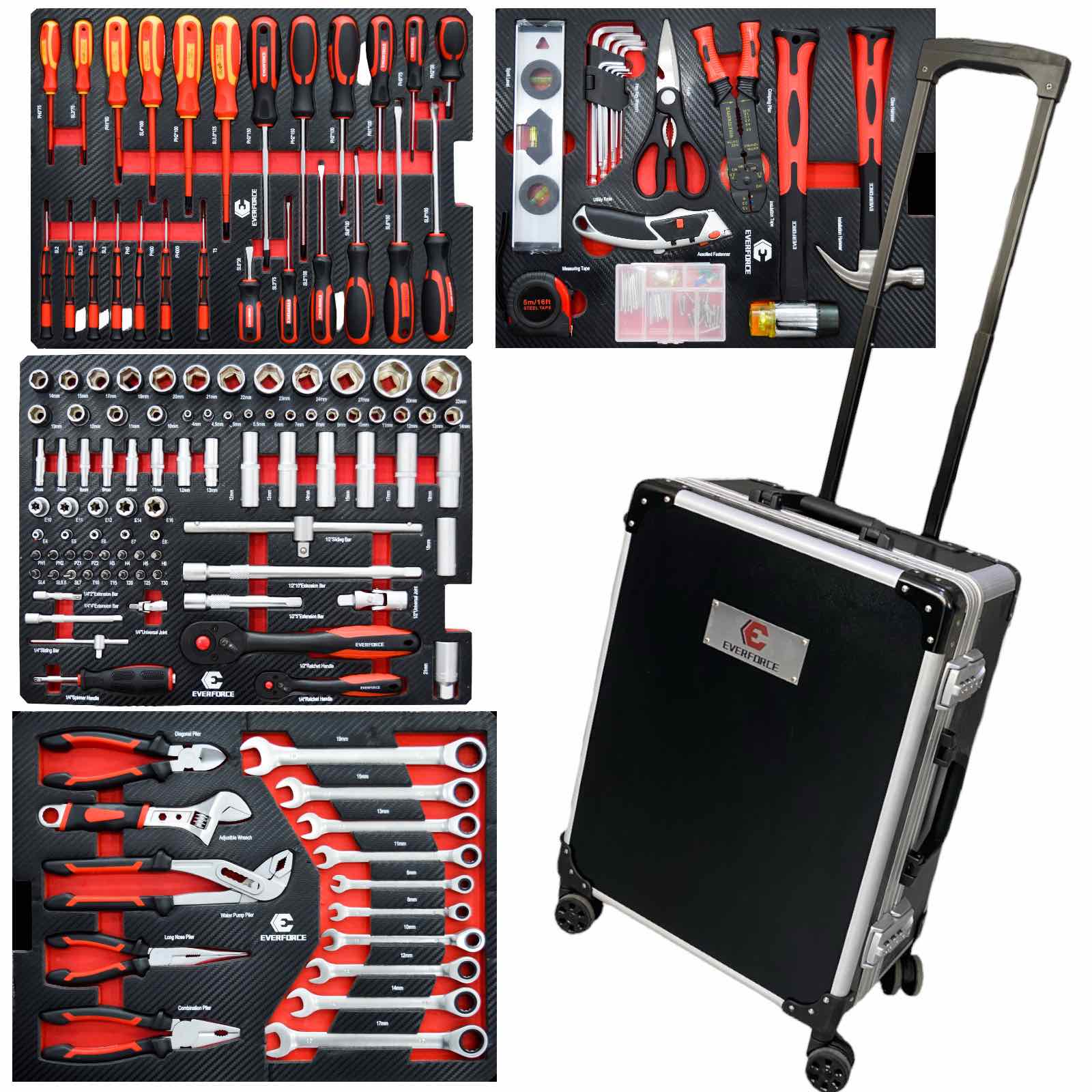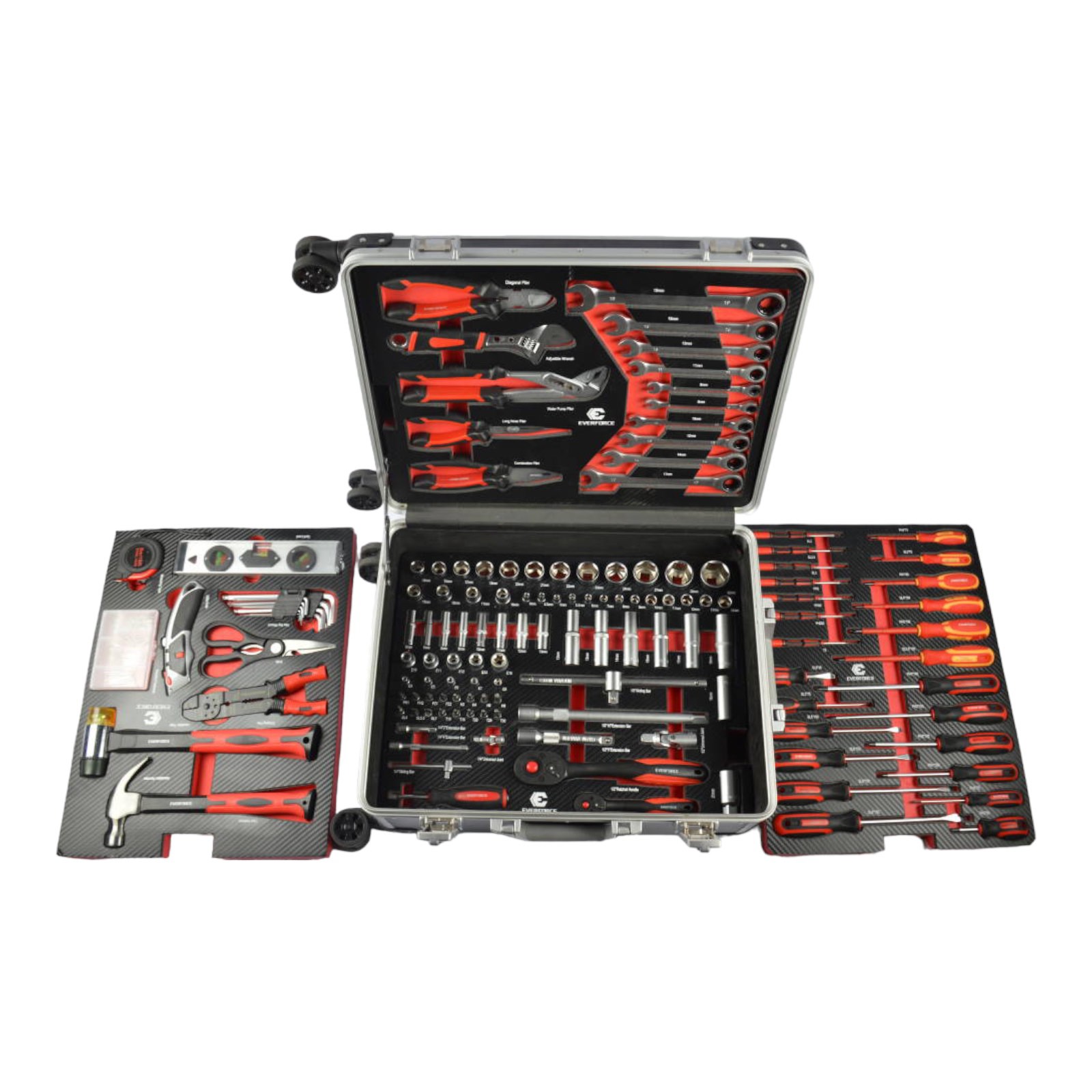 Куфарът за инструменти EVERFORCE от 238 части с карбонови поставки има удобна разтегателна дръжка и е оборудван с колела. Това улеснява вземането на инструментите с вас за работа на място и винаги имате всички инструменти на разположение. Компактният куфар има 4 отделения. По този начин инструментите могат да бъдат спретнато организирани, те остават на място, когато вземете случая със себе си, а правилните инструменти могат да бъдат намерени с един поглед. Кутията с инструменти съдържа всички основни инструменти за работа в и около къщата. Професионален комплект инструменти изработени от хром ванадиева стомана.