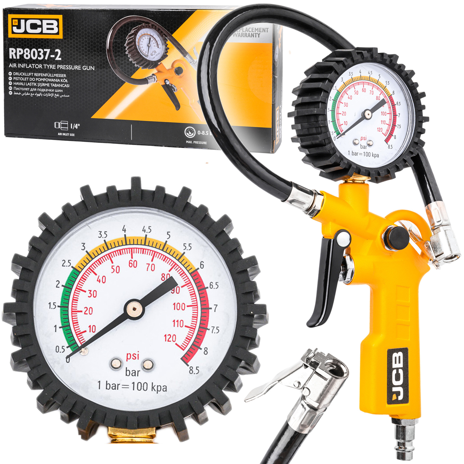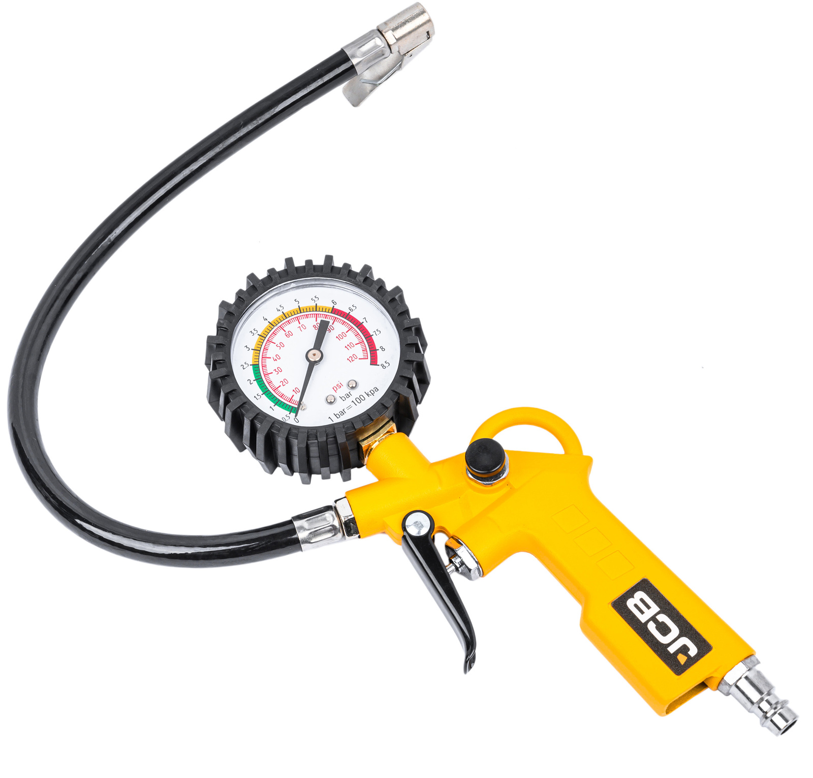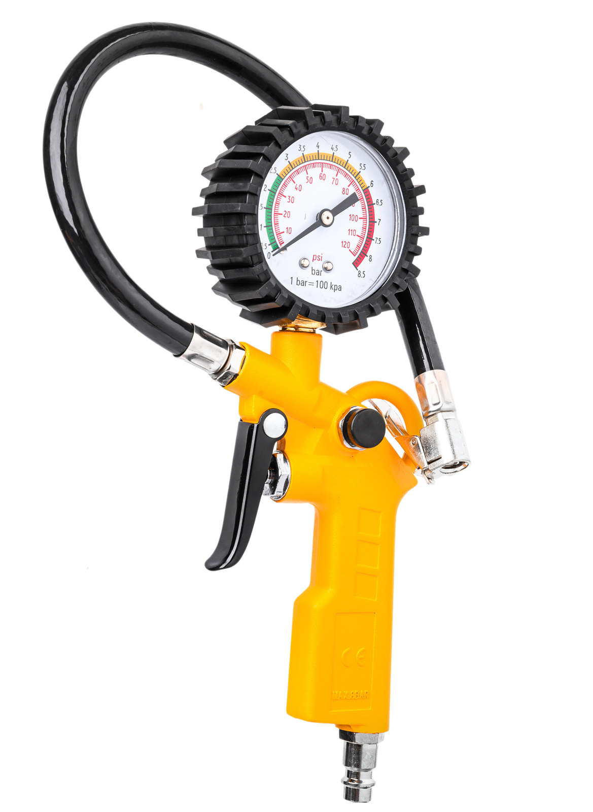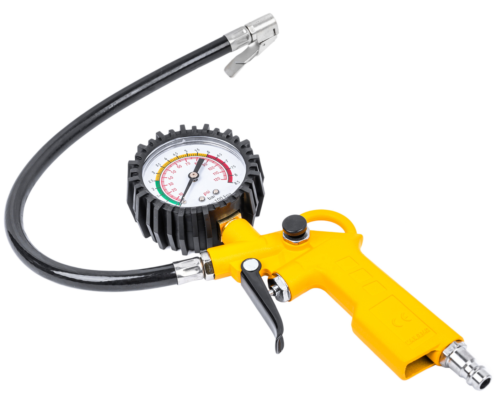 Професионален пневматичен пистолет с манометър – за помпане на джанти на автомобили и камиони. Снабден с гъвкав маркуч с дължина 37 см и голям читав манометър в гумено покритие, което предпазва от удари. Измервателна скала в две единици – Psi и Bar . Бързият съединител 1/4″ позволява бързо свързване към компресора.