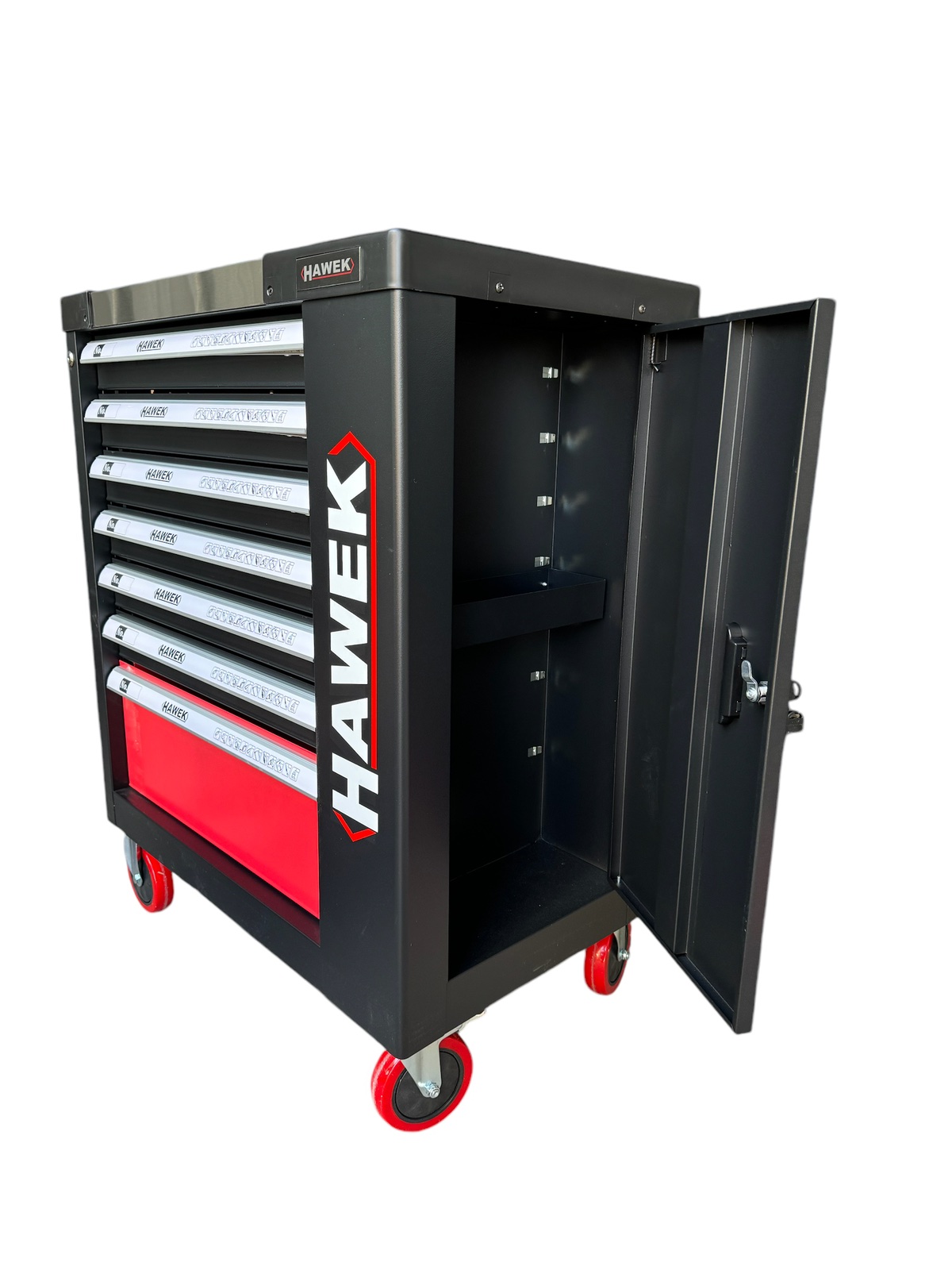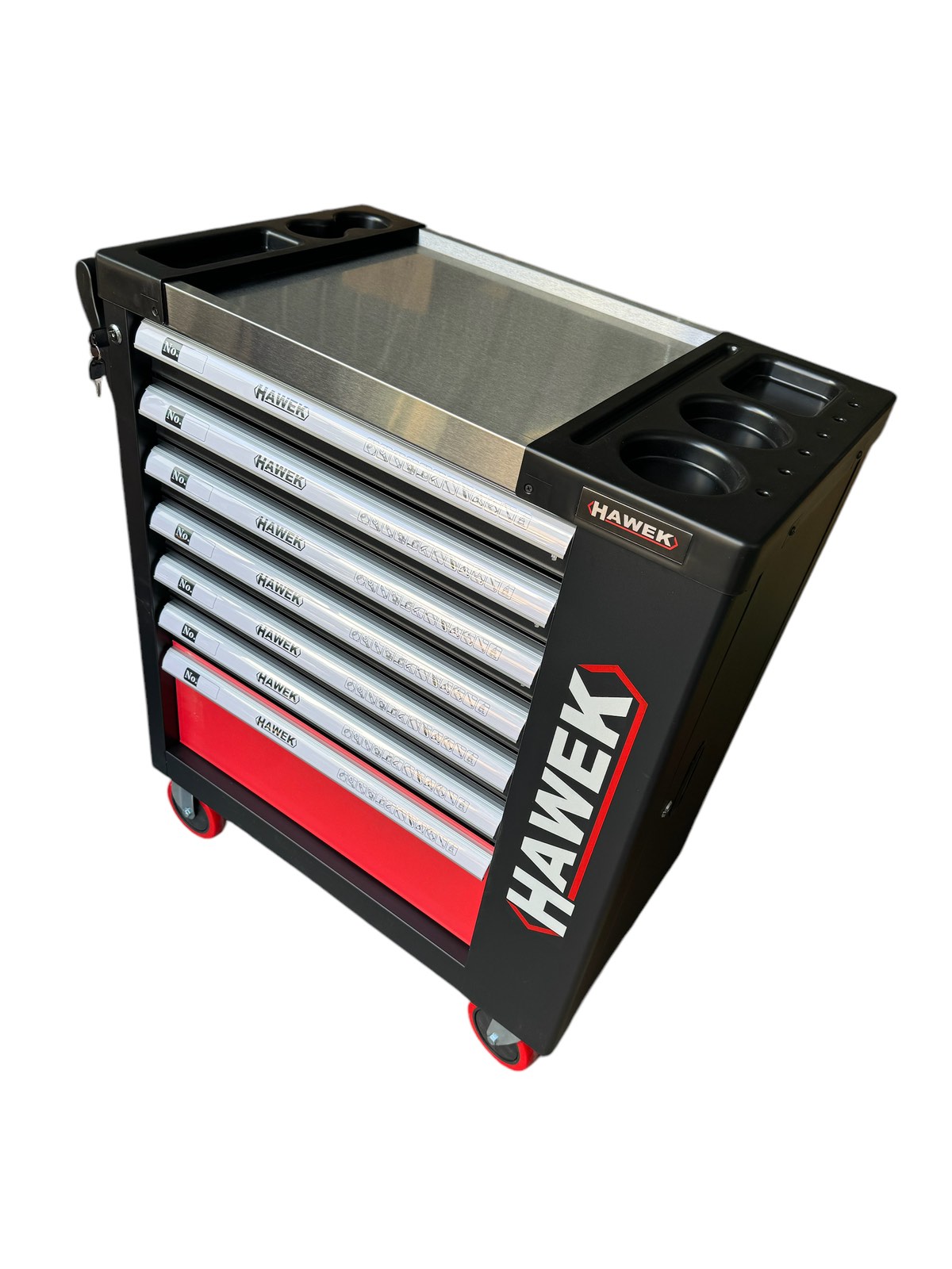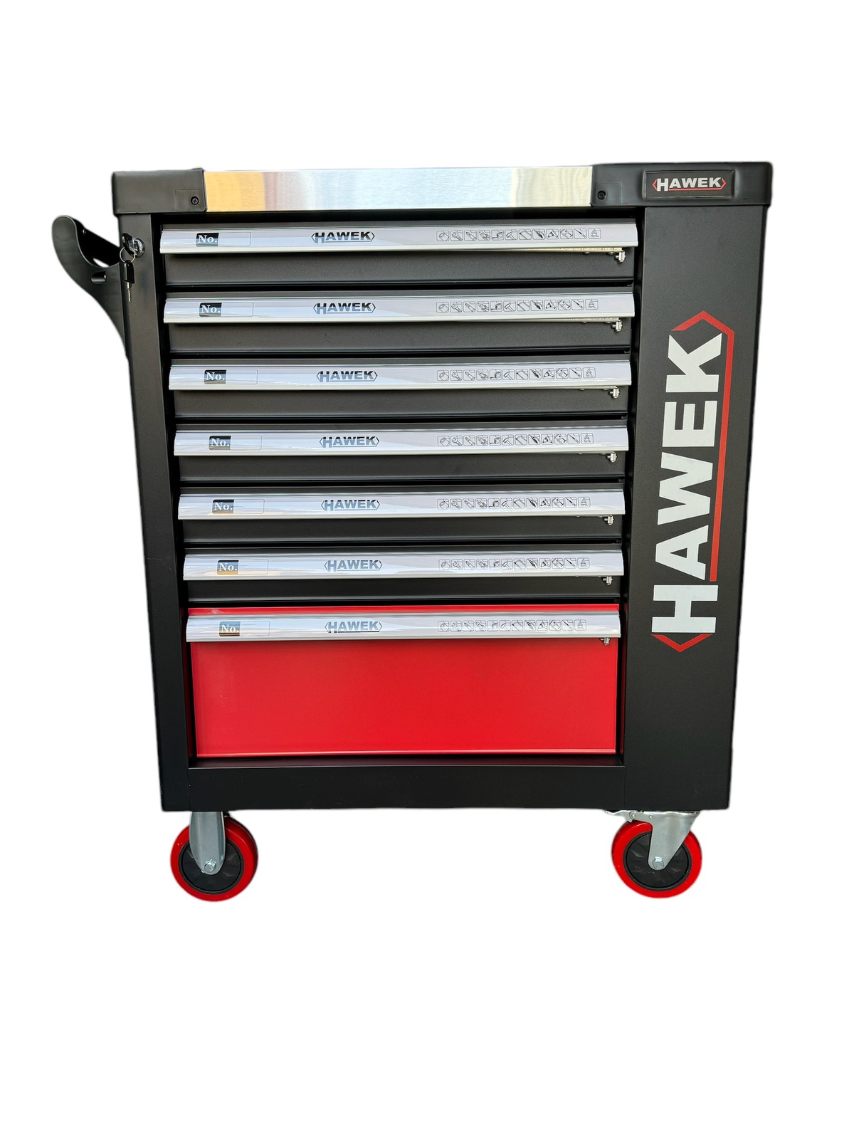 Шкаф с инструменти със 7 чекмеджета – 5 пълни, метален плот и отделение за закачане на инструменти HAWEK