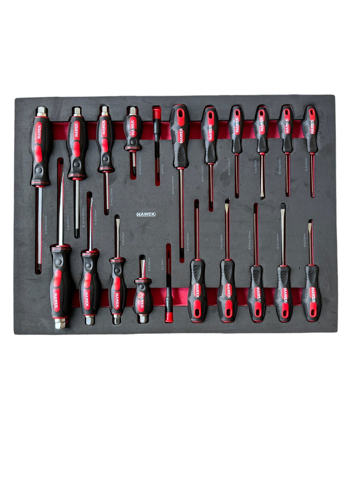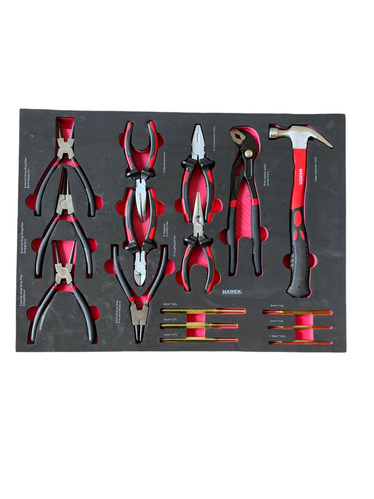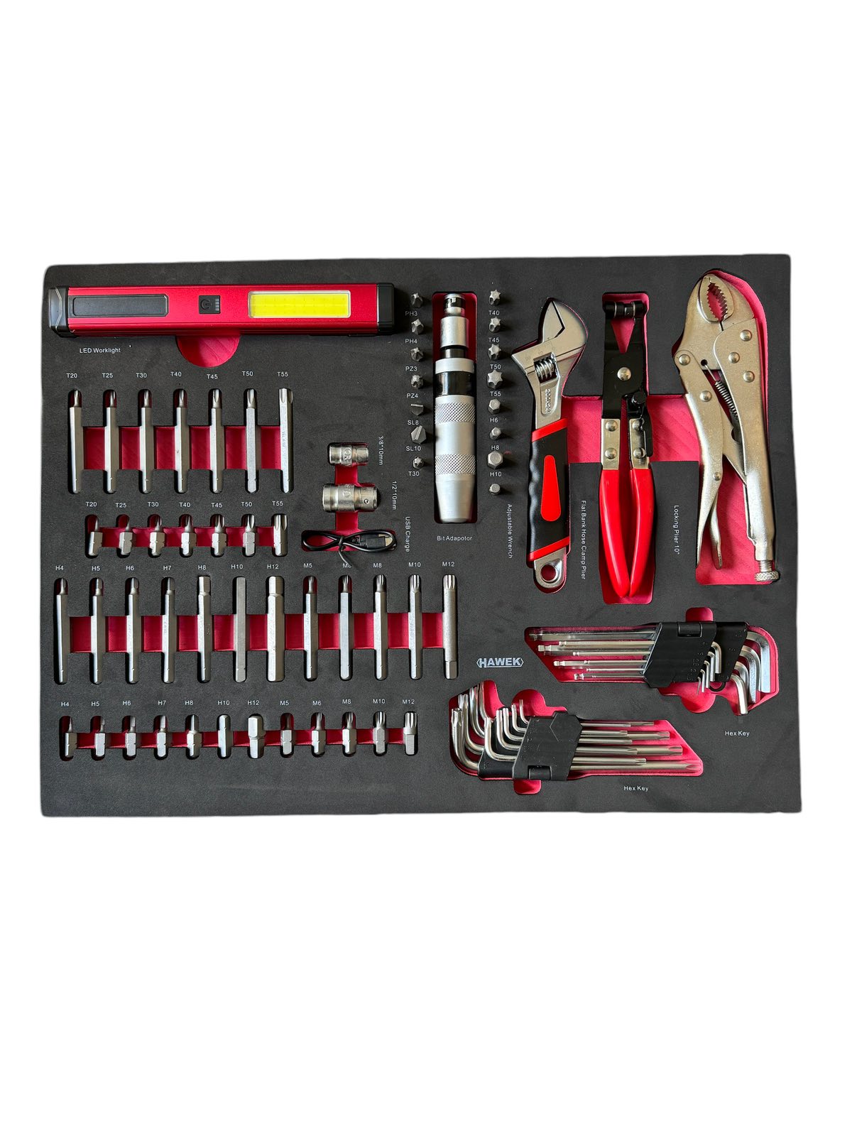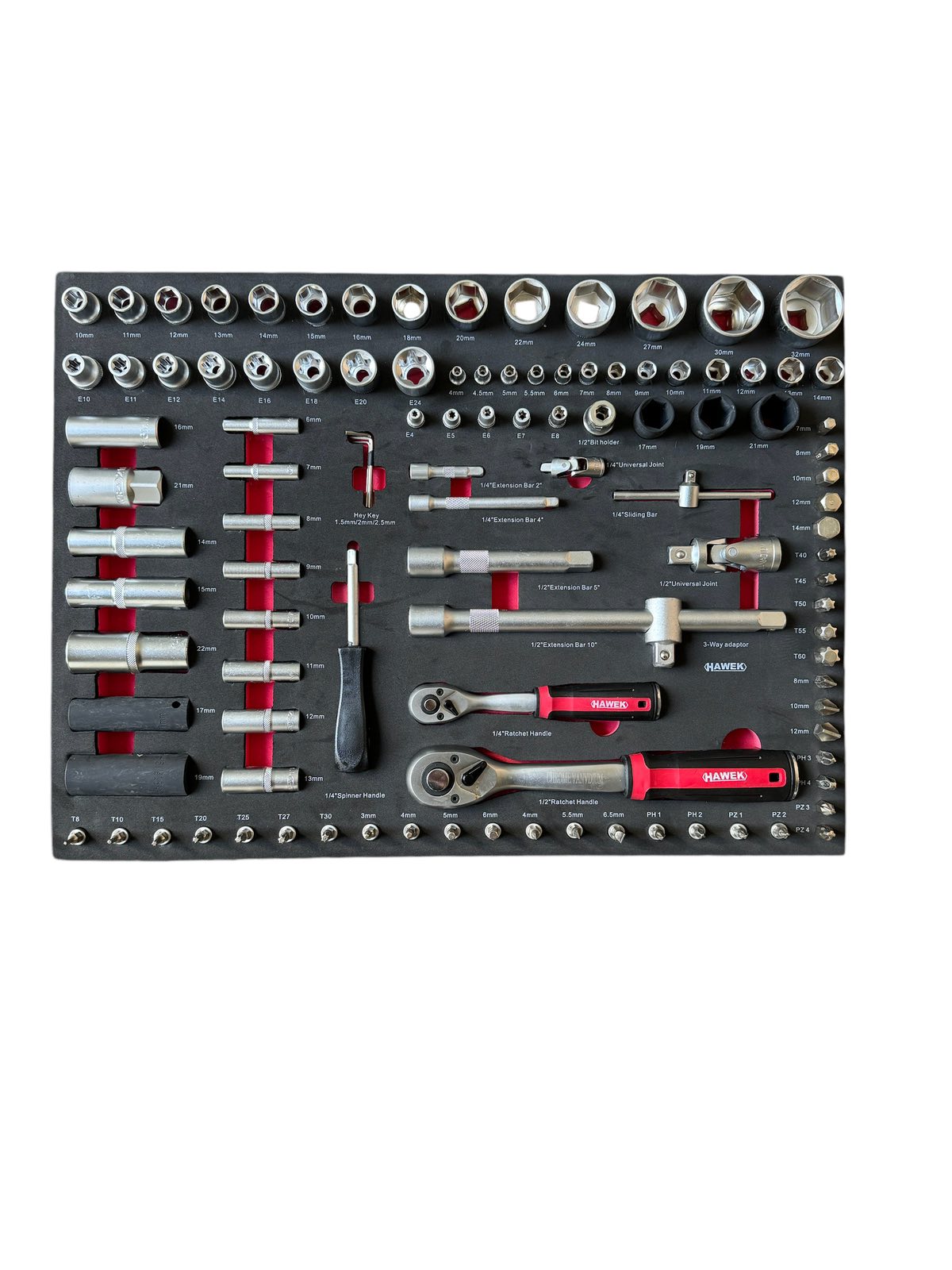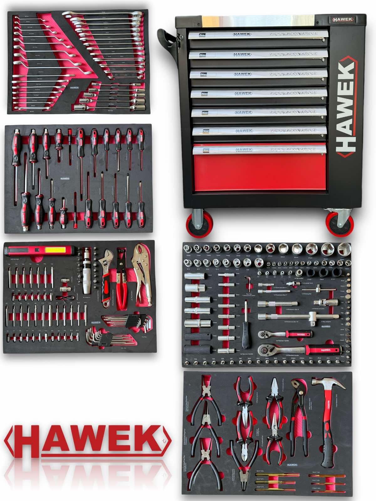 Количката за инструменти HAWEK съдържа 261 елемента, има 5 рафта с инструменти, 2 празни и допълнителна странична секция. Тялото е изработено от метал.